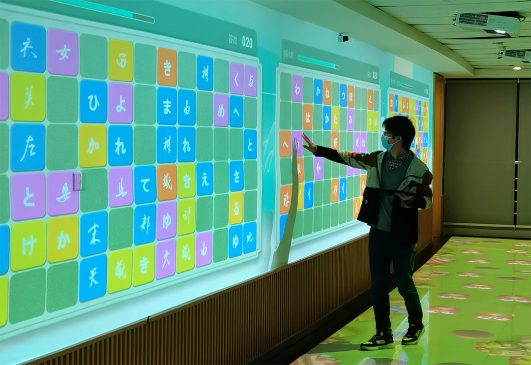 日韩文化馆内,有个特别的展位利用互动投影墙来吸引学生们,按照需求定制的互动程序“中日韩文字对照”连连看游戏,表意文字对应的词配对成功,即可消除文字。