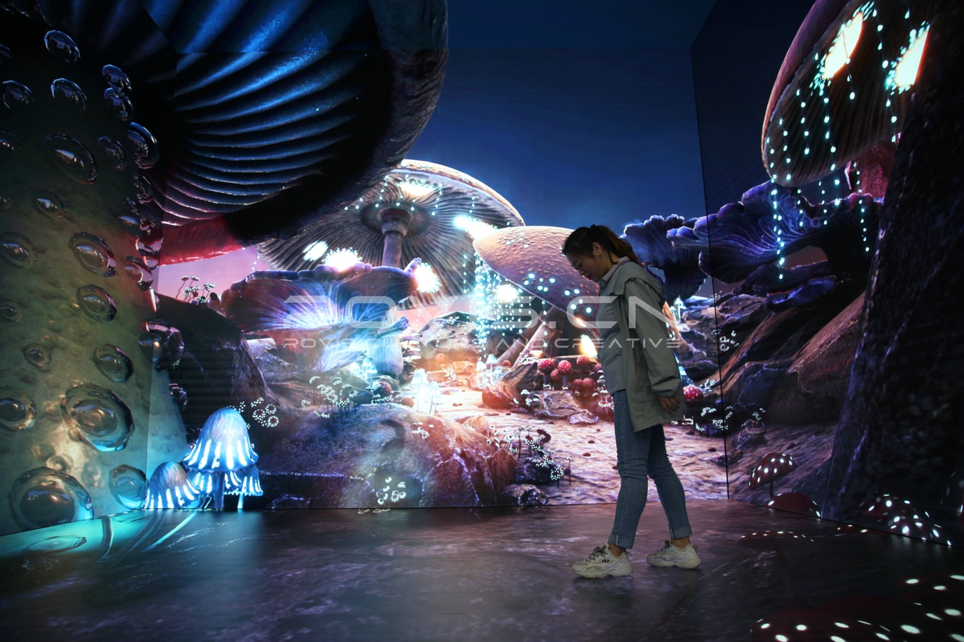 沉浸式CAVE是具备高度沉浸感虚拟现实系统,是把高分辨率的立体投影技术、三维计算机图形技术和音响技术等有机地结合在一起,产生一个完全沉浸式的虚拟环境,让观众置身于影片主题氛围中,给观众带来一种前所未有的震撼性的身临其境的沉浸式视听感受。