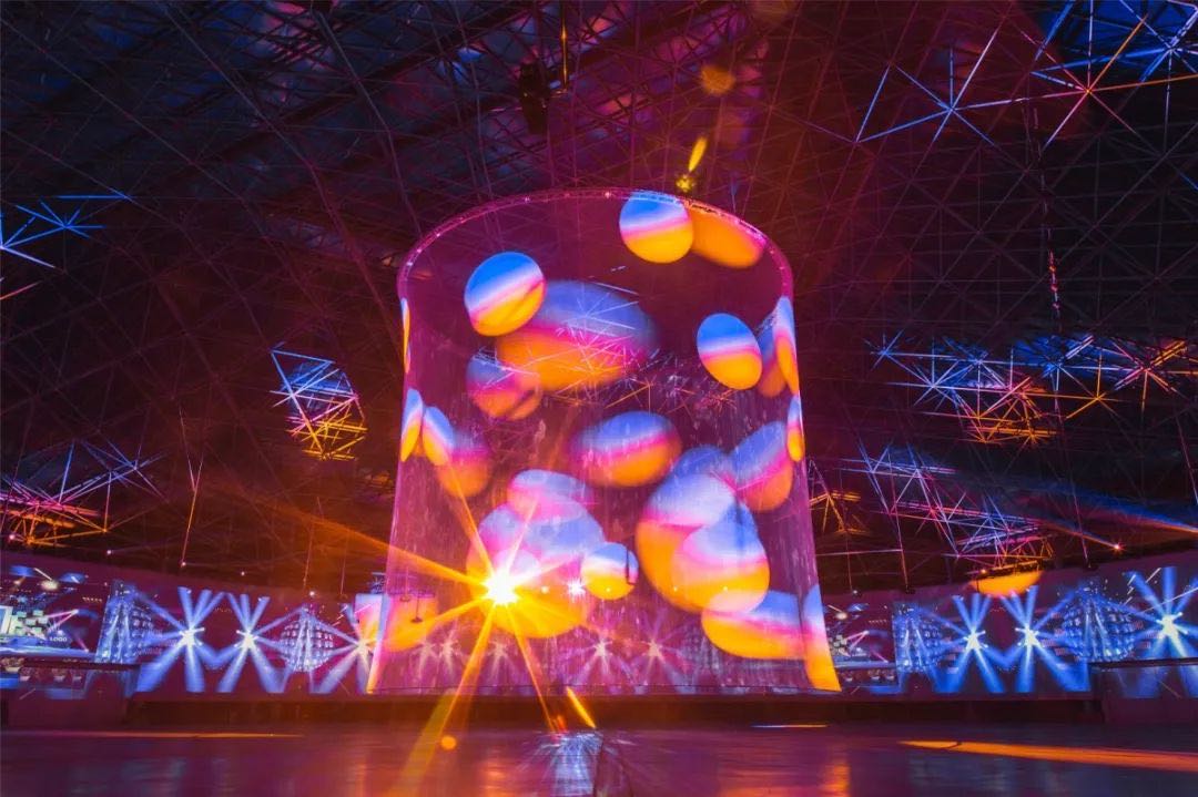 打破物理视觉的空间局限,再配置长达14米,高达16米的轻纱为幕,由32台激光投影仪将动态视频投射到纱幕上,画面相互融合,使纱幕浮现出梦幻绚丽的视觉效果。
